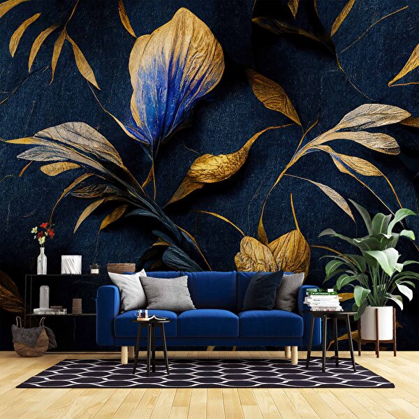 Duvarkagidibaski 3 Boyutlu Lacivert Altın Çiçek Desenli Duvar Kağıd - Dkm905065 100x280 cm