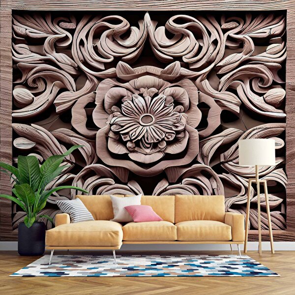 Duvarkagidibaski 3 Boyutlu Tablo Şeklinde Ağaç Oyma Desenli Duvar Kağıdı - Dkm927035 450x240 cm