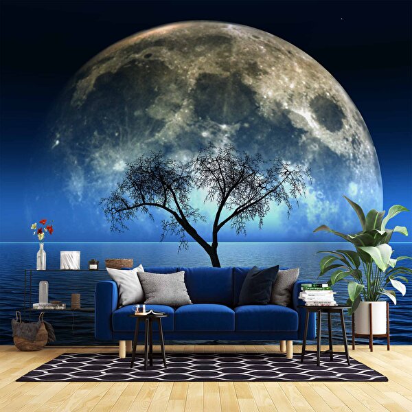 Duvarkagidibaski Ağaç Süliyeti Ve Ay Manzaralı Duvar Kağıdı Baskı - Dkm529084 800x280 cm