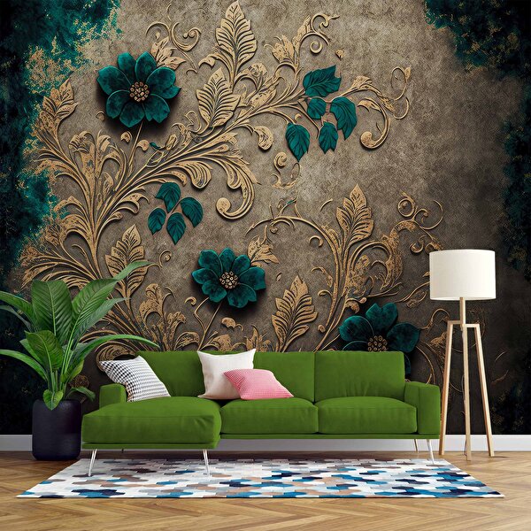 Duvarkagidibaski Altın Yaprak Yeşil Çiçek Desenli Duvar Kağıdı - Dkm916045 150x260 cm