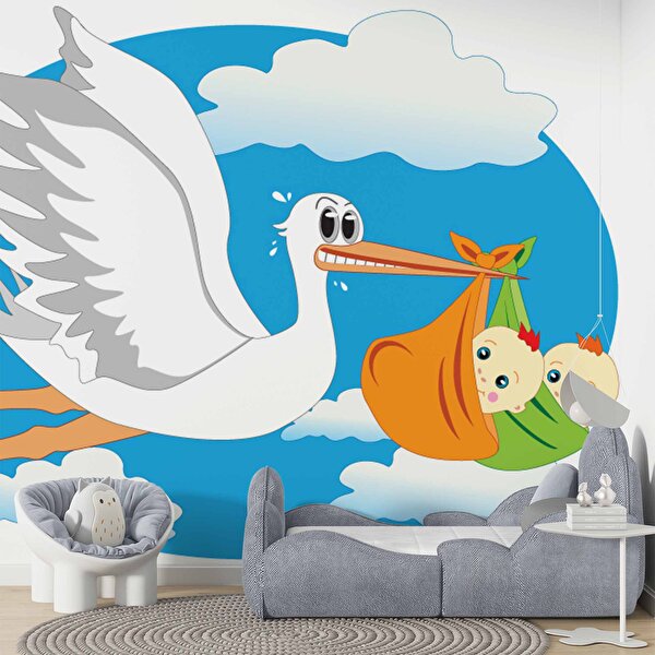 Duvarkagidibaski Bebek Getiren Leylek Çocuk Odası Duvar Kağıdı Baskı - Dkm419102 550x300 cm