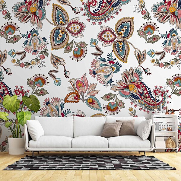 Duvarkagidibaski Beyaz Zemin Ve Renkli Çiçek Figür Çizim Desenli Duvar Kağıdı - Dkm846012 400x200 cm