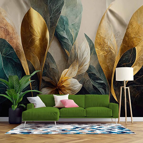 Duvarkagidibaski Yeşil Altın Yaprak Çizim Desenli Duvar Kağıdı - Dkm881009 325x200 cm