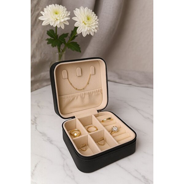 ### Ecrou Çift Gözlü Seyahat Tipi Takı Kutusu – Siyah- Şıklığı ve düzeni bir arada sunan bu siyah takı kutusu, seyahatlerinizde veya evinizde değerli takılarınızı özenle saklamak için ideal bir çözümdür.- Çift gözlü tasarım sayesinde kolye, bileklik gibi uzun takılarınız ile yüzük, küpe gibi küçük parçaları ayrı bölümlerde saklayabilirsiniz.- Kompakt ve taşınabilir yapısı sayesinde valizde, çantada ya da seyahat çantasında kolayca yer alır.- Siyah renk tonu sayesinde minimalist ve modern bir görünüm sunar, her tarz dekorasyona uyum sağlar.- Sık seyahat edenler için: Bagajda ya da el çantasında düzenli bir çözüm arayanlar.- Takı koleksiyonu bulunanlar için: Her gün kullanılan veya özel günlerde takılan parçaların bir arada ve güvenli saklanması için.- Hediye arayanlar için: Zarif tasarımı ile hediye kutusunda sunulmaya hazır.**Kullanım önerileri**- Alt ve üst bölmeleri kullanarak takılarınızı “her gün kullanılanlar” ve “özel günler” olarak ikiye ayırabilirsiniz.- İç kısmına küçük jel paketleri koyarak nemden koruyabilirsiniz.- Kutuyu makyaj çantanıza ya da valize yerleştirerek “havaalanında son dakika takı kontrolü” yapabilirsiniz.