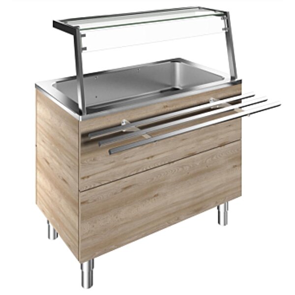 Dolapta soğutmalı hazne, statik (3 GN hazne kapasiteli), LED ışıklı üst raf ve müşteri tarafında bir adet paslanmaz çelik boru tepsi kaydırıcısı H=900mm 0,55 ElekW 220-240 V 1N 50 Hz GxDxY 1100x915x1304 mm kg 143,00 m³ 1,11