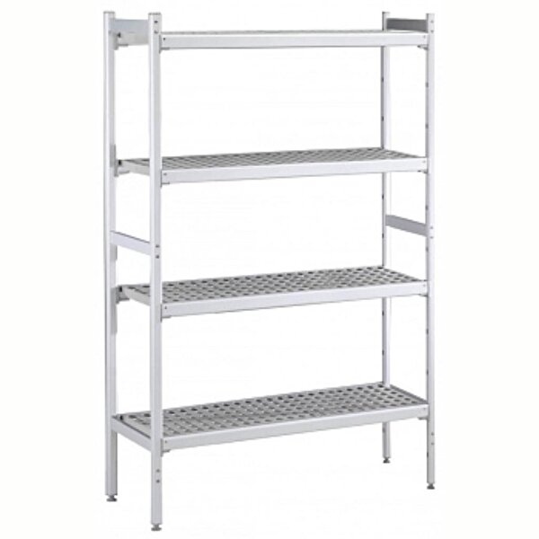 Doğrusal kurulum için. Jaluzili bölmeli polietilen raflara sahip 4 katlı raf seti (derinlik=475 mm). Alüminyum (20 mikron) yan dikmeler (yükseklik=1700 mm). Ayarlanabilir ayaklar.