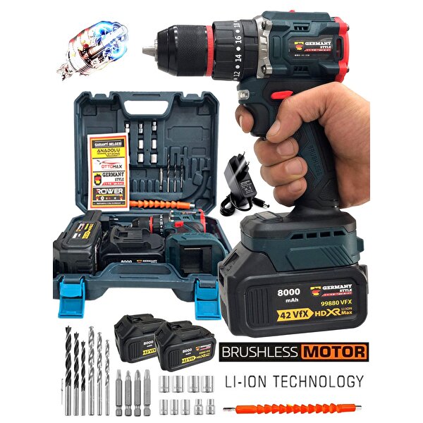 Germany Style Pro Çift Akülü Vidalama Çelik Mandren Kömürsüz Motor Darbeli Şarjlı Matkap Seti Ürün Açıklaması Germany Style Çift Akülü Vidalama Darbeli Şarjlı Matkap, güçlü  Li-Ion bataryası ve kömürsüz motoru ile zorlu delme ve vidalama işlemlerini kolaylıkla gerçekleştirmenizi sağlar. 13mm çelik mandren, dayanıklılık ve güvenilir sıkma sağlar. Darbeli özelliği, daha sert malzemelerde bile etkili delme performansı sunar. çift aküsü ve 10 pilli dahili bataryası, uzun süreli kullanımlarda bile kesintisiz performans sağlar. 60 dakikalık hızlı şarj süresi ve hafif tasarımı, kullanımı kolay ve pratiktir. Metal şanzımanı ve 2 yıl garanti süresi, ürünün dayanıklılığına ve kalitesine olan güveni gösterir. Kullanım Alanları İnşaat ve montaj işleri Ahşap ve metal işleme Ev tadilat ve tamirat işleri Elektrik ve tesisat işleri