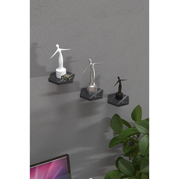 Gold Falez Duvar Rafı Dekoratif 3 Adet Çiçeklik Altıgen Siyah Mermer Desen Bendir
