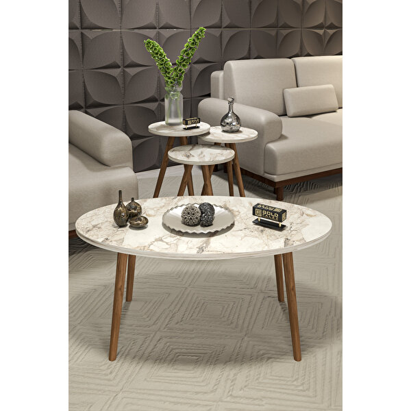 Gold Falez Orta Sehpa Ve 3 Lü Zigon Sehpa Torna Elips Efes Bej