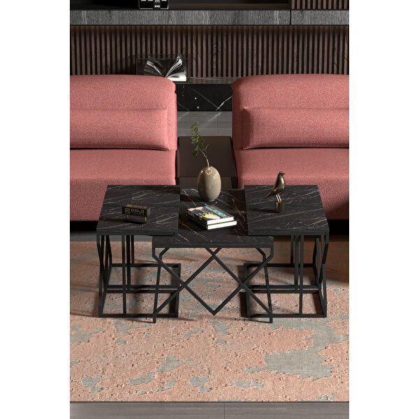 - Modern tasarımıyla dikkat çeken orta sehpa ve zigon sehpa seti, evinizin dekorasyonuna şıklık katar.; - Bu set, hem fonksiyonel kullanım sunar hem de mekanınıza estetik bir dokunuş sağlar.; - Üst tabla sunta lam Ayaklar 1.kalite metal malzemesi sayesinde dayanıklı ve uzun ömürlü bir kullanım vaat eder.; - Kare şekliyle modern çizgilere sahip olan bu sehpa seti, her türlü iç mekana kolayca uyum sağlar.; - İki yıl garanti süresi ile satın alma sonrasında da güvenle kullanabileceğiniz bir üründür.; - Üreticisi Berrin Alpaslan tarafından tasarlanan bu set, kalite standartlarına uygun olarak üretilmiştir.;