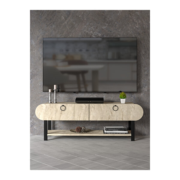 Yaşam alanlarınıza hem estetik hem de fonksiyonellik katmak için tasarlanan bu özel tv sehpası 1 paket halinde demonte gönderilmektedir.; ; Traverten taş ve mermer görünümlü özel sunta lam yüzeyi ile doğallığı modern çizgilerle buluşturan bu tv ünitesi, hem sade hem de şık dekorasyon sevenler için ideal.; ; Her parçası uyum içinde tasarlanan bu set, zamansız bir şıklık sunarken, günlük kullanımda da maksimum konfor sağlar.; ; TV SEHPASI ÖZELLİKLER; ; ÖLÇÜLER: ; TOPLAM YÜKSEKLİK:43 CM ; ALT RAF İLE KAPAKLI BÖLMEYE KADAR OLAN YÜKSEKLİK:16.5 CM ; ÜST TABLA UZUNLUK GENİŞLİK:110*30 CM ; KAPAKLI YER UZUNLUK GENİŞLİK :130*20 CM ; TV’nize zarif bir alan, eşyalarınıza düzenli bir saklama çözümü arıyorsanız, bu ürün tam size gör ; Bu TV sehpası, kaliteli sunta lam malzemesiyle uzun ömürlü kullanım sunarken, dekoratif kapak tasarımı ve çok amaçlı raflarıyla hem estetik hem de pratik bir çözüm sunar.; ; Uydu alıcısı, oyun konsolu veya dekoratif eşyalarınız için ideal kullanım alanı sağlar ; Avantajları; ; Geniş depolama alanı - Modern ve şık tasarım - Kolay temizlenebilir yüzey ; Salonunuza değer katacak, hem tarzınızı yansıtacak hem de düzen sağlayacak bu şık TV sehpası ile tanışın ;