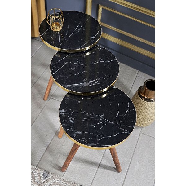 Gold Falez Zigon Sehpa 3'lü Ahşap Torna Ayak Gold Bendir Siyah Mermer Desenli