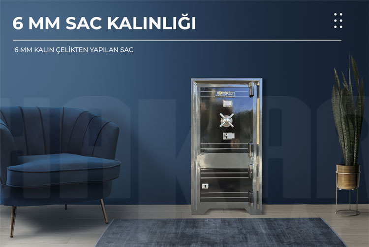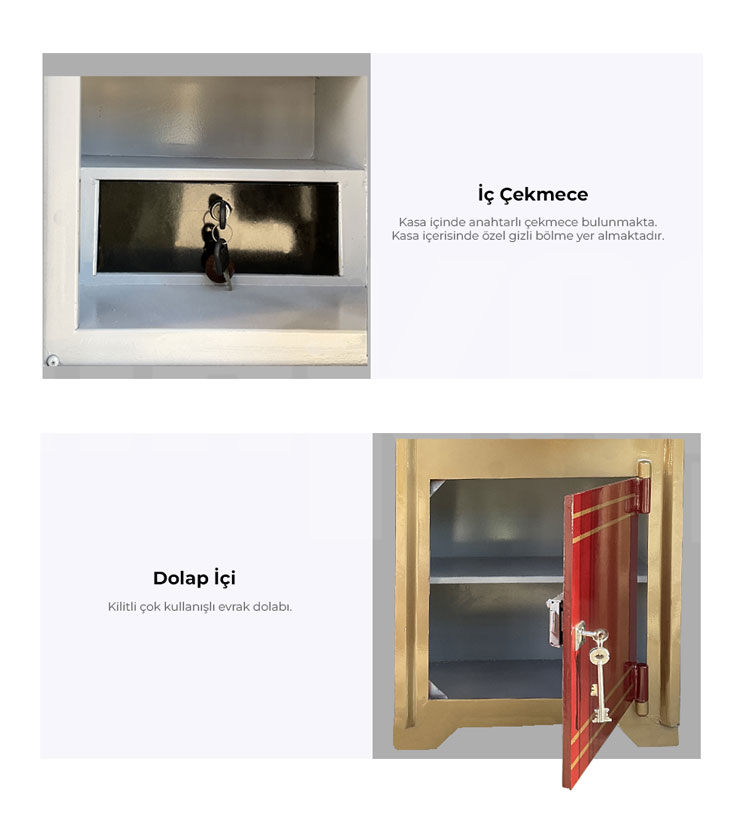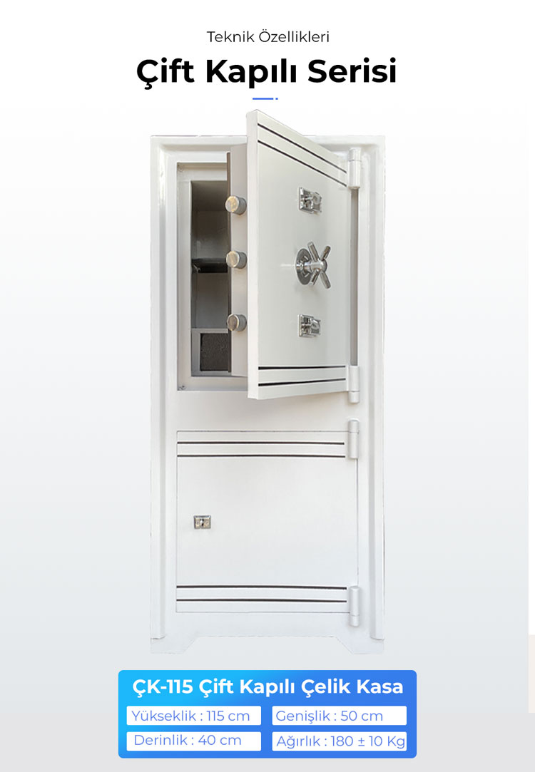 Dış ebatlar : 115 x50 x45 Ağırlık : 250 kg A)ana gövde yapısı: 1-Dış duvar kalınlığı darbe mukavemeti için 4mm lik çelik sac 2-Ara dolgu malzemesi kum, mermer tozu (mozaik dolgu) 3 -Iç cidar sac kalınlığı 2 mm lik çelik sac B)kapak gövde yapısı: 1-Kapak dış duvar kalınlığı 6 mm 2- Iç cidar 2 mm çelik sac C)kilit ve arkası 1-Kilitlerin önüne delinmeyi önleyici 30x30 sulandırılmış çelik sac 2-Kilitlerin arkasına 10x30 lama dayaması 3-Kilit sistemi 1 adet çift taraflı(kademeli) 1 adet emniyet kilidi birbirini açmayan antep kilit 4-Kilit mekanizmasının arkasına 2 mm çelik sac
