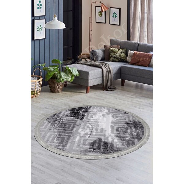 Halı Antrasit Cool Karo Saçaklı Yuvarlak Kesme Ince Yolluk Kilim Salon Halısı Modelleri 90x90 cm
