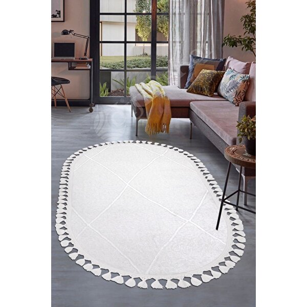 Halı Beyaz Cool Bohem Desenlidesenli Yıkanabilir Saçaklı Oval Yolluk Salon Halısı