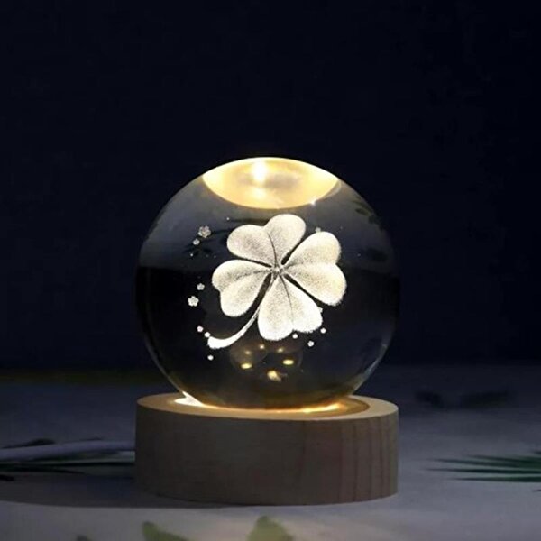 Dekoratif Çiçek Tasarımlı Ahşap altlıklı Işıklı Cam Küre Büyük Boy Cam:8cm Ahşap:2cm