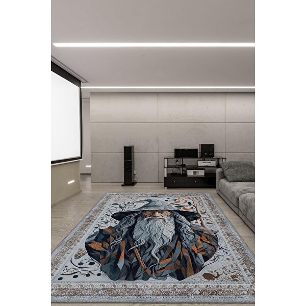 Homshtag Gandalf Figürlü Geleneksel Desenli Mavi Turuncu Gri Renkli Yüzüklerin Efendisi Halısı 200x300 cm