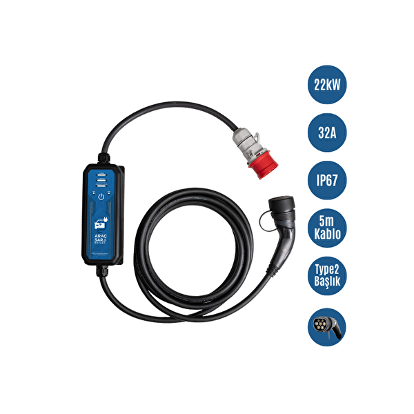 Huzur Elektrik 22kw 32a 5m Kablolu Portatif Taşınabilir Ev Araç Şarj Cihazı