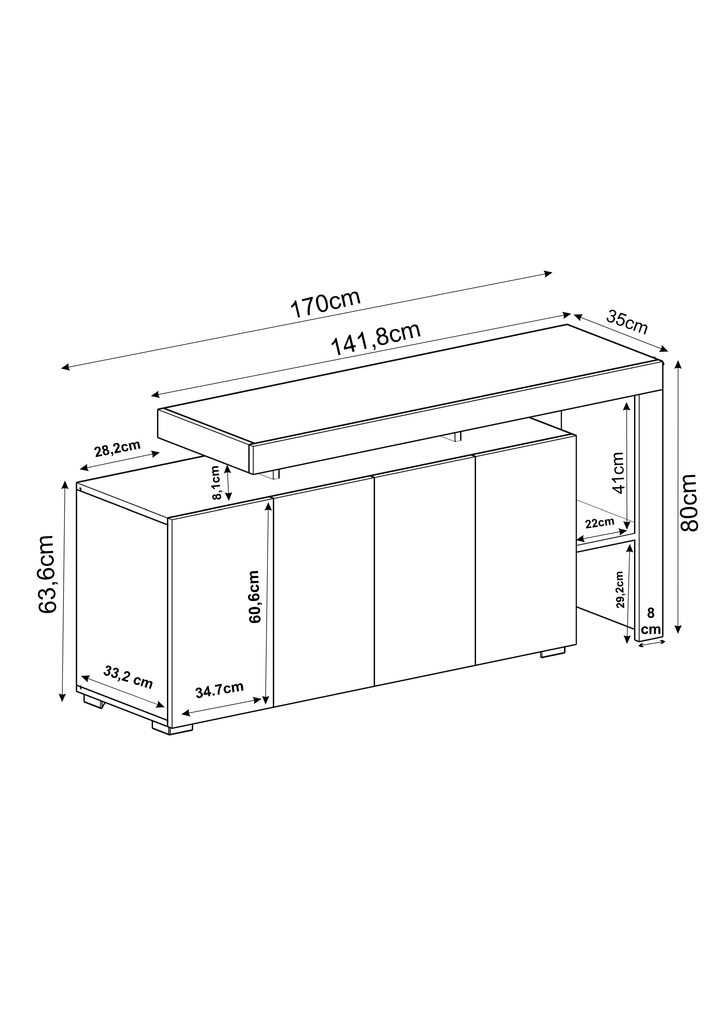 Beliz Modern Konsol, çağdaş tasarımı ve fonksiyonel yapısıyla yaşam alanlarınıza şıklık katıyor. 170 cm genişliğe sahip bu konsol, dört kapaklı dolap bölmesi ve iç raflarıyla geniş depolama alanı sunar. Adaptörlü prize takılarak çalışan LED ışık sistemi, modern çizgileriyle ve 6 renk seçeneğiyle salon, oturma odası, yemek odası, mutfak veya ofis dekorasyonuna uyum sağlar.