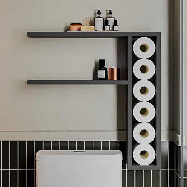 Duvara monte edilen tasarımı sayesinde zeminde yer kaplamaz; üst ve orta rafları kişisel bakım ürünleri, dekoratif objeler veya temizlik malzemeleri için kullanılırken, dikey bölmesi 8 adet tuvalet kağıdı rulosunu düzenli şekilde saklamanıza olanak tanır.
