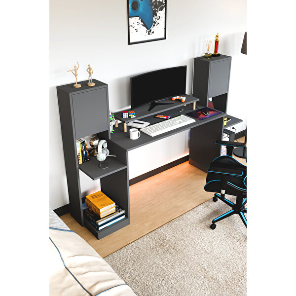 InterGO Throne Dolaplı, Kitaplıklı, Raflı Çalışma Masası, Bilgisayar Masası, Çocuk Çalışma Masası Antrasit Gri