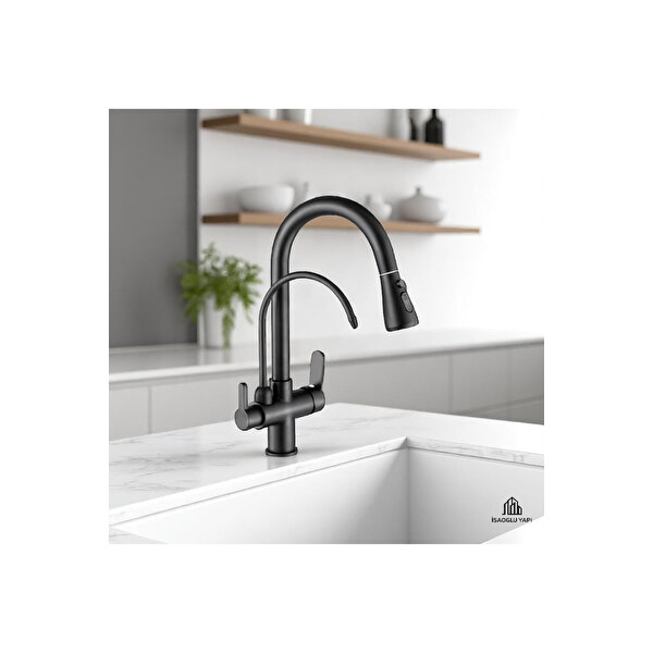 İsaoğlu Yapı Siyah Spiralli Arıtmalı Yeni Nesil Armatür Evye Bataryası Mat Siyah Tazzikleme Ve Su Basınç Ayarlı