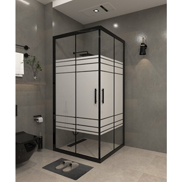 İskit Duşakabin 70 X 70 Kumlama Cam Desen 05 Kare Köşe Girişli Kabin Siyah Profil 6mm 70x70 cm