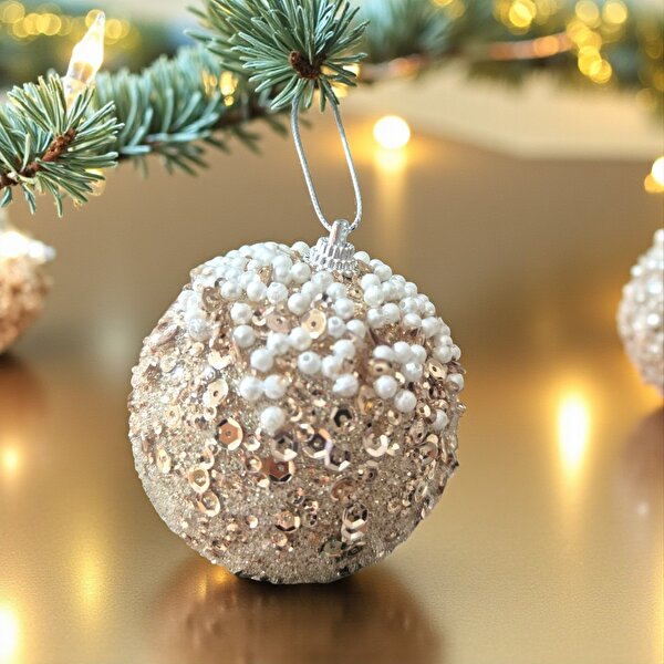 Yılbaşı Topu Simli İnci ve Payet Detaylı Çam Ağacı Süsü Şampanya