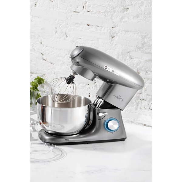 Karaca multichef stand mikser antrasit 1400w 5,5 lt (kıyma çekme /sucuk-sosis/i̇çli köfte aparatlı) özellikler 1400w 5,5 litre paslanmaz çelik kase. 6 kademeli hız ayarı. yörüngesel hareket etme özelliği. güvenlik kilidi. uzun ömürlü metal iç aksam. aşırı yük, motor koruması. sabitleyici ayaklar. 3 farklı kıyma bıçağı olan kıyma aparatı. sıçrama önleyici şeffaf kapak. sıvı karışımlar için balon çırpıcı. orta yoğunlukta hamurlar için düz karıştırıcı. yoğun hamurlar için hamur kancası. i̇çli köfte aparatı. sucuk-sosis aparatı.