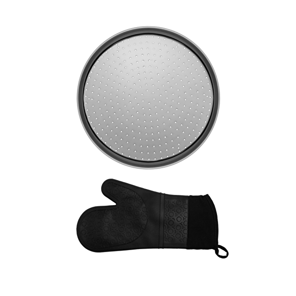 Kitchen Design Lab Orta Boy Delikli Pizza Tepsisi Lahmacun Pide Tepsisi 32 Cm Ve Siyah Silikon Yanmaz Fırın Eldiveni