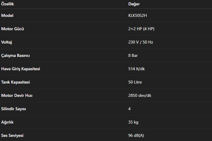 KLPRO KLK50S2H, güçlü motor sistemi, sessiz çalışma prensibi ve dayanıklı yapısıyla endüstriyel işler, atölyeler ve profesyonel kullanıcılar için ideal tercihtir.
