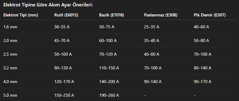 Elektrot Tipine Göre Akım Ayar Önerileri: