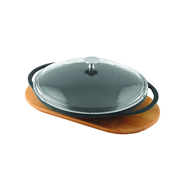 Lava Döküm Yuvarlak Saç Kavurma Tavası Döküm Demir Yekpare Çift Kulplu Cam Kapaklı Kayın Servis Ahşabı Çap(ø)28cm.