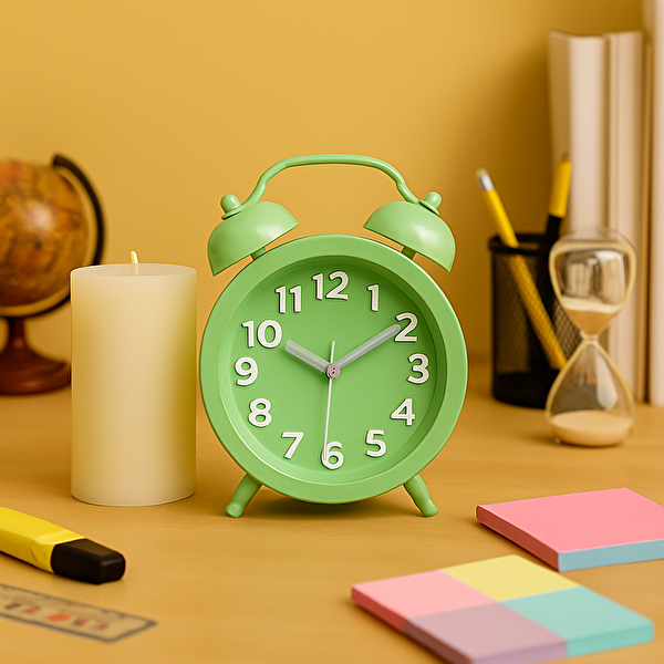 Livava Yuvarlak Alarmlı Metal Masa Saati, Yeşil, 15x10 Yeşil