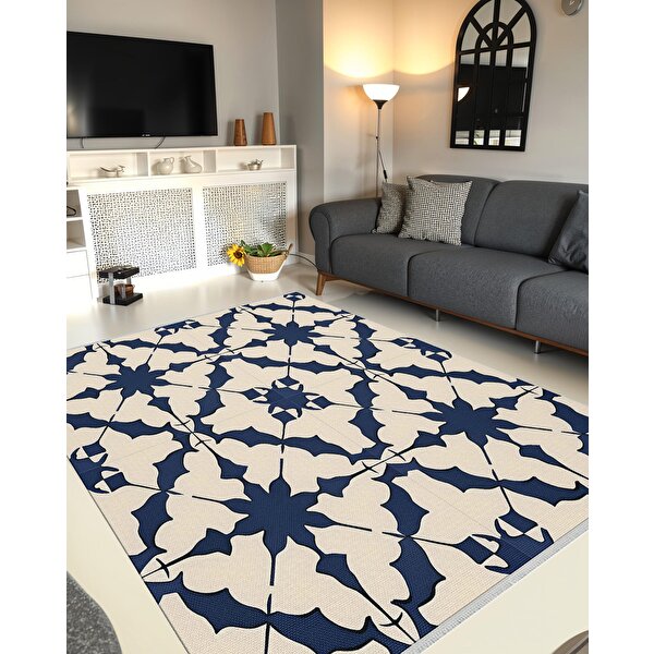 Lofy Halı Halı – Lacivert; Krem – Geometrik Desen, Pamuk Dokuma Taban, Makinede Yıkanabilir, Kolay Temizlenebilir, Toz Ve Tüy Tutmaz, Kaymaz, Evcil Hayvan Dostu 120x270 cm