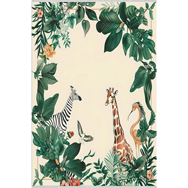 Lofy Halı Oturma Odası Halısı – Krem; Yeşil – Safari Hayvan Desen, Makinede Yıkanabilir, Kolay Temizlenebilir, Toz Ve Tüy Tutmaz, Kaymaz, Evcil Hayvan Dostu 80x80 cm