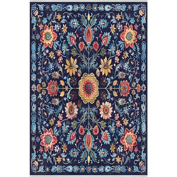 Lofy Halı Pamuk Dokuma Taban Halı – Lacivert; Kırmızı; Sarı; Mavi – Geleneksel Floral Tasarım, Eskitilmiş Görünüm, Makinede Yıkanabilir, Kolay Temizlenebilir, Toz Ve Tüy Tutmaz, Kaymaz, Evcil Hayvan Dostu 80x80 cm