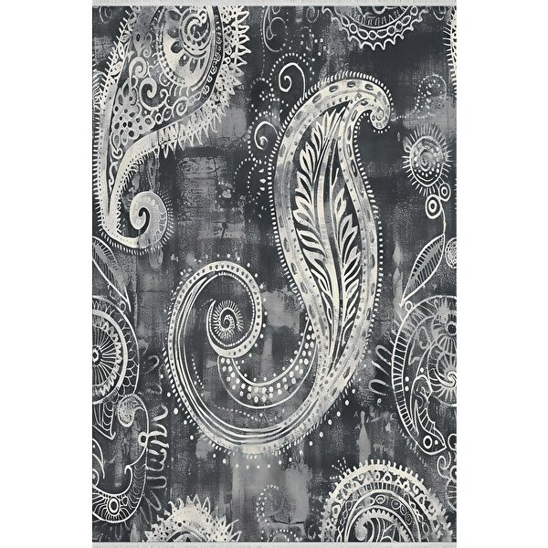 Lofy Halı Pamuk Dokuma Taban Halı – Siyah; Beyaz; Gri – Paisley Desen, Makinede Yıkanabilir, Kolay Temizlenebilir, Toz Ve Tüy Tutmaz, Kaymaz, Evcil Hayvan Dostu 120x270 cm