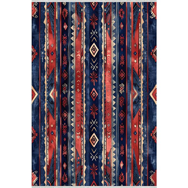 Lofy Halı Pamuk Tabanlı Kaymaz Halı – Kırmızı; Lacivert; Bej – Etnik Desen, Makinede Yıkanabilir, Kolay Temizlenebilir, Toz Ve Tüy Tutmaz, Evcil Hayvan Dostu 120x270 cm
