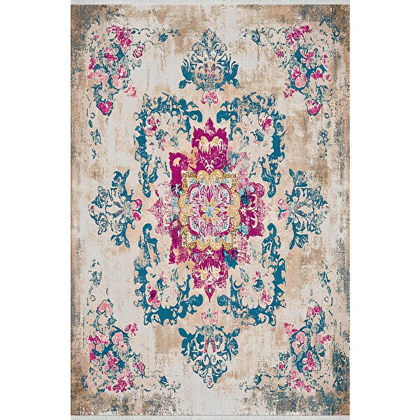 Lofy Halı Pamuk Tabanlı Kaymaz Halı – Mavi; Pembe; Bej – Oriental Desen, Makinede Yıkanabilir, Kolay Temizlenebilir, Toz Ve Tüy Tutmaz, Evcil Hayvan Dostu 150x300 cm