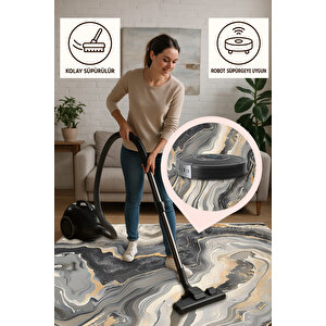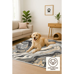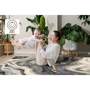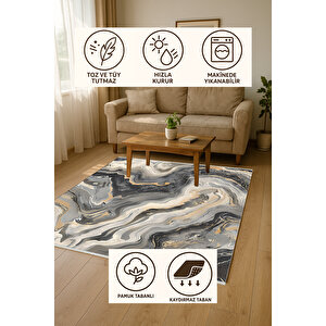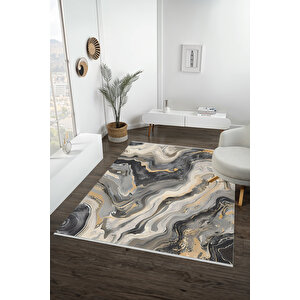Lofy Halı Siyah, Gri Ve Bej Tonlarında Halı, Mermer Görünümlü Soyut Desenli, Yıkanabilir Ve Evcil Hayvan Dostu 120x270 cm