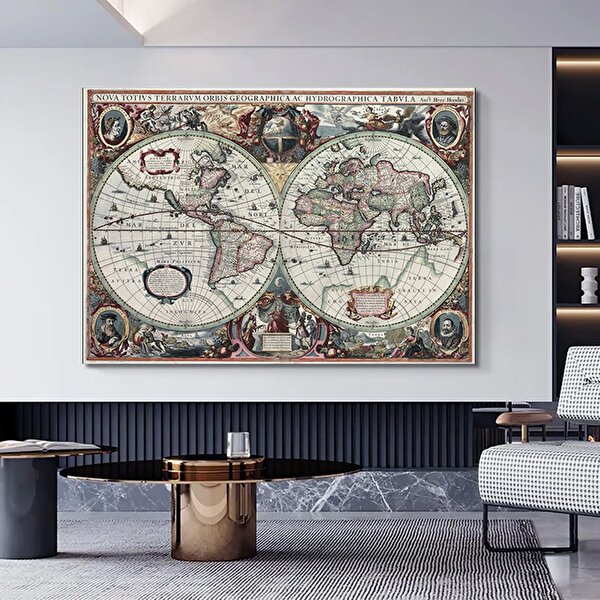 Modern tablo 1630 Dünya Haritası Kanvas Tablosu; 17. Yüzyıl Detaylı Dünya Haritası 50x70 cm