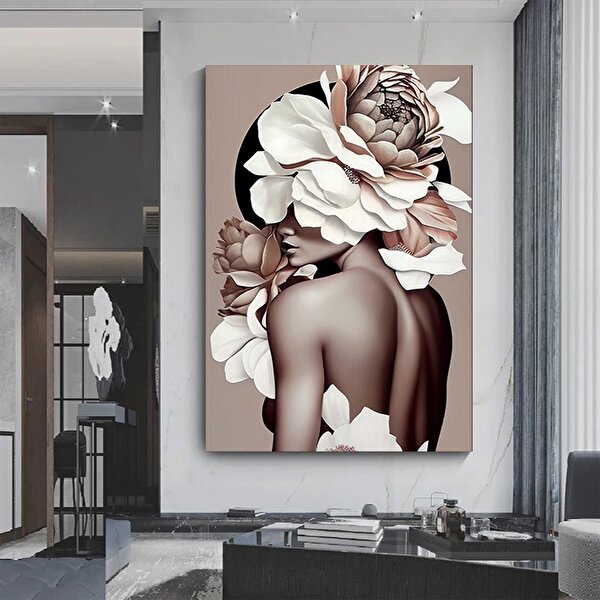 Modern tablo Çiçek Başlıklı Kadın Portresi, Zarif Kadın Temalı Kanvas Baskı, Asılmaya Hazır 100x150 cm