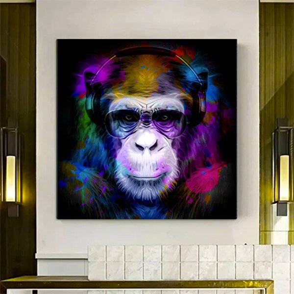 Modern tablo Renkli Maymun, Müzik Dinleyen Maymun Duvar Sanatı, Maymun Kanvas Baskısı, Hayvan Resimleri 100x100 cm
