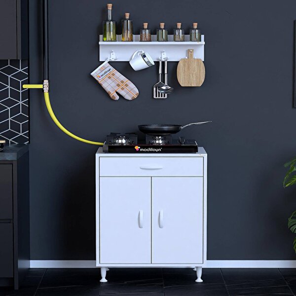 Modilayn Qplas (l) Ocak Altı 1 Çekmece Ve Kapaklı 1 Raflı Set 65 Cm Genişlik 56 Cm Derinlik + Askılı Baharat Rafı 65 cm