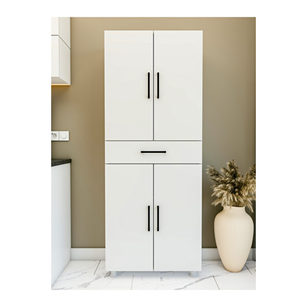Ürün Açıklaması: Şık ve kompakt 4 kapaklı, çekmeceli çok amaçlı dolap; Ölçüler: Derinlik: 35 cm, Yükseklik: 177 cm (ayak dahil), Genişlik: 70 cm, Ayak yükseklik: 8 cm ; Malzeme: Ürünün gövdesi 18 mm parlak beyaz suntalamdır.; Arkalık beyaz MDF'dir.; Ayaklar beyaz, güçlendirilmiş plastiktir.; ; Kolay kurulum: Matkap kullanımı gerektirmez, ürünü yalnızca tornavida ve çekiç ile montajlayabilirsiniz.; Ürün üzerindeki tüm delikler açılmış olup kurulum sırasında delme işlemi gerektirmez.; Kurulum için gerekli hırdavat seti (vida, minifix, çivi vb.; ) koli içerisinde yer almaktadır.; Detaylı olarak hazırlanmış montaj kılavuzu ile kısa sürede kurulum yapabilirsiniz.; ; Kalite: Ürünlerimizde 1. Kalite Yonga levha kullanılmaktadır.; TSE, Avrupa birliği EN, ISO 9001 ve FSC sertifikalarına sahiptir.; E1 standartları dahilinde, kanserojen madde içermez.; Tüm üretim proseslerinde detaylı kalite kontrolü yapılmaktadır.; ; Paketleme: Ürünün temiz ve hasarsız olarak tarafınıza iletilebilmesi için gerekli tüm önlemler alınmıştır.; Üründe kırılmayı önlemek için petek panel, köşebent ve balonlu naylon kullanılmaktadır.; Güçlendirilmiş oluklu mukavva ile kırılmalar en aza indirilmektedir.; ; Paket İçeriği ve Teslimat: Ürün taşıma kolaylığı ve dayanım sağlaması açısından 2 paket olarak gönderilmektedir.; Ürün kargo firmaları tarafından kata teslimat yapılacak şekilde paketlenmiştir.; ; Bakım Talimatı: Az miktarda deterjanlı bir bez ile siliniz.; Temiz bir bez ile kurulayınız.; ; Müşteri Desteği: Her türlü hasar ve eksik parça durumunda iletişime geçerek yedek parça talebinde bulunabilirsiniz.; Hasarlı parçaları bize tekrar göndermeniz gerekmez.; ; Güvenlik: Devrilebilen mobilyaların duvara sabitlenmesi önerilmektedir.; ; Not: Ürün demonte halde gönderilmektedir.; Ürüne sadece çok amaçlı dolap dahildir.; Görsel amaçlı kullanılan objeler dahil değildir.; Ürün renkleri ekrana göre değişiklik gösterebilir.; ;