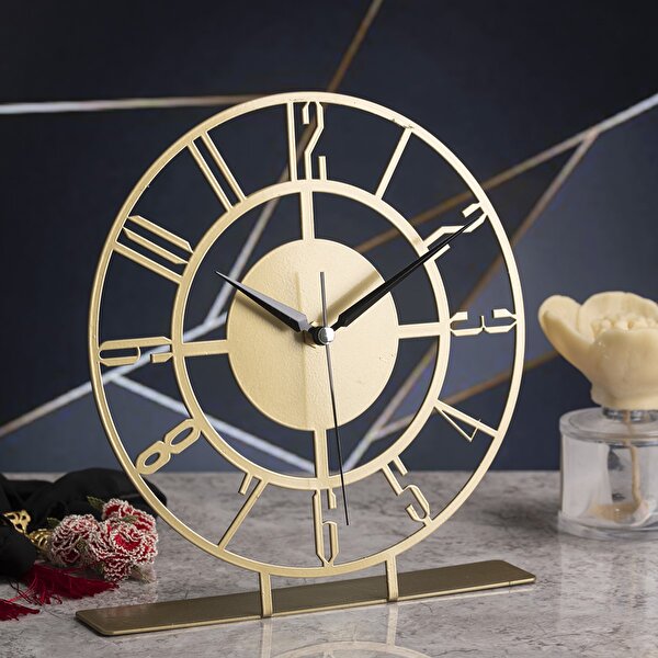 Masa Üstü Saati koleksiyonumuzdan 2 0mm kalınlığında metal, modern,dekoratif masa üstü saati ürünüdür Ofisler, evler ve kapalı yaşam alanları için mükemmel bir hediyedir Ürün Detayları : Dokulu Metalik Statik Boya 2 0mm kalınlıkta metal malzemeden üretilmiştir Akrep, Yelkovan ve Saniye takımı Metalik Gold renktir Sessiz , Akar Saniye kullanılmıştır Sadece iç mekanda kullanım içindir (banyo dışında) Ürün paket içeriğinde pil bulunmamaktadır Ürün ile birlikte garanti belgesi ve kullanım klavuzu gönderilmektedir Ürün Boyutları : 23cm genişlik x 25cm yükseklik x 4cm derinlik Montaj: Ürün herhangi bir montaj gerektirmez ve metal sabit ayak sayesinde düz zeminde durabilmektedir