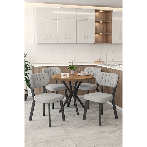 Mygusi Gnr 90cm Sabit Atlantik Mutfak Masası Takımı, Yemek Masası, 4 Modern Gri Sandalye Açık Gri