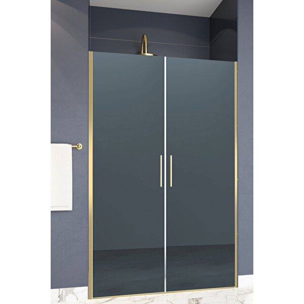 Netdeko Mono Temperli 6 Mm Boy Menteşeli Ön Cephe Duşakabin Altın Profil Mavi Reflekte Cam 129 cm