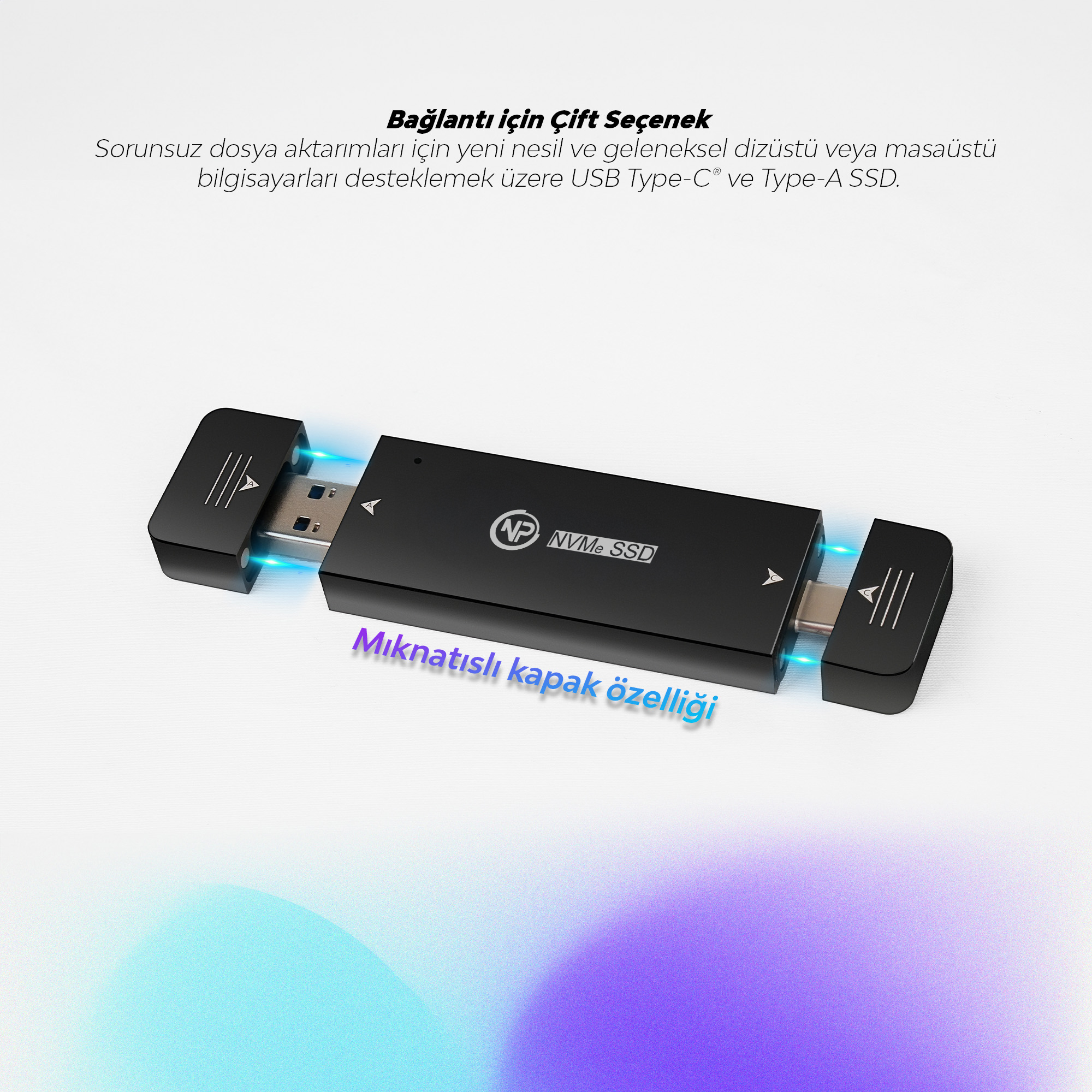 USB 3.1 Type-A ve Type-C bağlantı noktalarına sahip olan bu cihaz, farklı tipteki cihazlarla uyumlu çalışır. Hem eski nesil cihazlar hem de yeni nesil cihazlarla sorunsuz bir şekilde veri transferi yapılabilir.